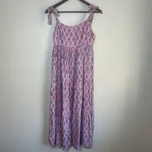 Keywords: Boho, Cottagecore, Coastal Grandmother, Summer, Vacation, Resortwear, Sustainable, Blockprint, Romantic, Breezy, Tiered Dress, Floral Maxi
