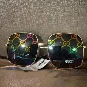 Stylish GG sunglasses with gold frames. Features multicolor lenses with iconic logo pattern. Perfect for a bold look. New. Never worn. Come with little black pouch.