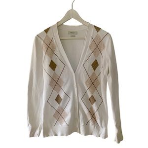 Van Heusen Argyle Knit Cardigan Women Size Small Cream Brown Cotton V Neck