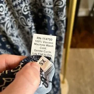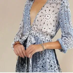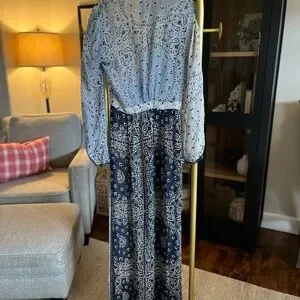 Stylish maxi dress with a deep V-neck. Features intricate patterns and long sleeves. Ideal for versatile wear. Neck tags removed, but believe free people.