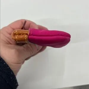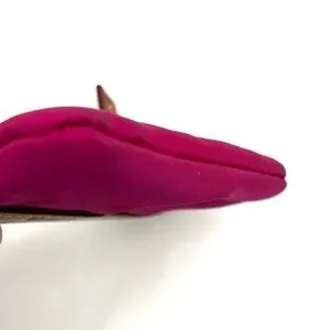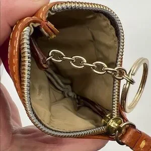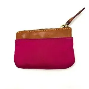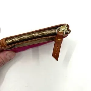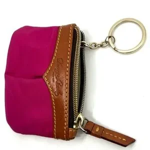 Dooney & Bourke compact, small coin case or key case. Pink nylon with brown leather trim. Interior has the attached key ring. Exterior has one back slip pocket. Could be used as a key cles to hold your keys and keep the from scratching the inside of your handbag, or as a small compact coin case. Such a fun SLG in a beautiful pink color! I consider this piece to be in very good used condition. Minor darkening at corners, but that’s the only significant where I see, a couple of small water marks to the back on the leather.