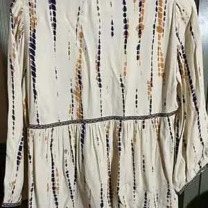 Add a touch of Parisian Flair to your wardrobe with this V Neckline, three quarter blouson sleeve, tie dye patterned, with beautiful embroidered detail blouse. This garment is cut loose for flowing bohemian fit. 100% Viscose. Color Vanilla and Lavender. Style # IE241ISIS Style Name ISIS.