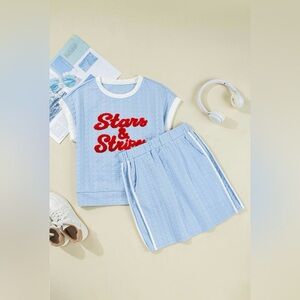 This textured knit matching set features a soft short-sleeve top with cuffed sleeves and a bold “Stars & Stripes” graphic, paired with a flattering high-rise skirt with an easy pull-on elastic waist.