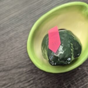 Vintage Avacado salt and pepper shakers with stoppers and Avacado dipping, fruit, candy bowl. Green textured ceramic. No markings on the bottom not sure of origin. Measurements are approximate measurements: shakers 2 1/4 inches. Bowl 4 inches long 3 inches wide