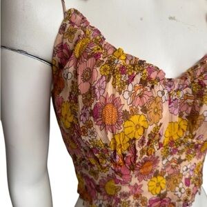 Patrons of Peace crop bra top camisole. Pale blush background with gold, pink, fuchsia, orange, and white floral print. Tiny ruffle at bottom. Smocked in back with single tiny covered button closure.