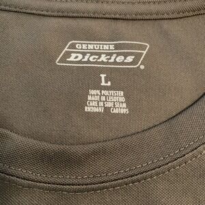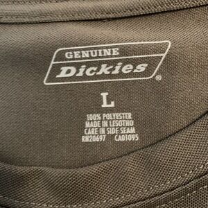 Branding and labels: "Genuine Dickies" logo printed inside neck plus woven Dickies logo tag on chest pocket.