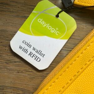 New Yellow Daylogic coin wallet with RFID blocking technology, featuring a "Safe Keeper" design. It is crafted from a textured faux leather material with a secure top zipper closure.