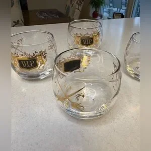 Roly Poly cocktail glasses , featuring 22k gold accents and a royal crest design.