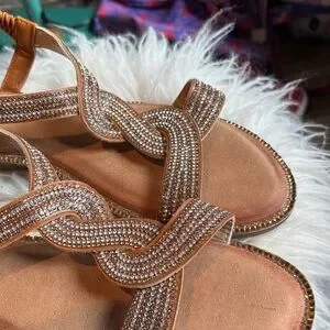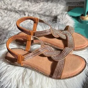Elevate your look with these chic tan sandals, adorned with sparkling accents. Ideal for any stylish outing.