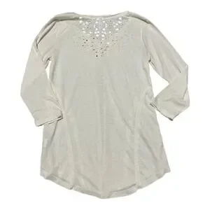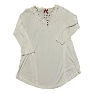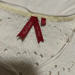 Add a touch of boho charm to your everyday look with this Red Camel cream/ivory ¾ sleeve top. Features delicate lace embroidery and eyelet detailing on the front and back, accented with decorative buttons and a sweet red ribbon neckline. Soft, lightweight fabric makes it perfect for layering or wearing solo in any season.
