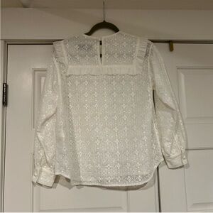 White cotton tricot ruffled detail blouse from COMME DES GARÇONS TRICOT featuring tricot knit, floral embroidery, ruffled detailing, round neck, rear button fastening, long sleeves, buttoned cuffs and curved hem.