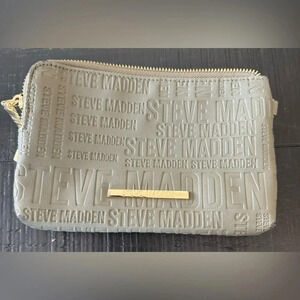 Elegant Steve Madden wristlet with embossed logo. Features floral design. Perfect for versatile styling.