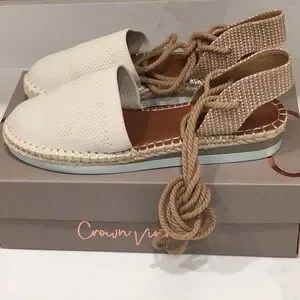 Step out in style with these chic cream espadrille sandals. Perfect for any casual outing, these shoes offer comfort and elegance. Crown Vintage CV Brialle. Color is white swan/natural in knit. Size 10M. Rope lace up as pictured. Worn one time. Clean inside.