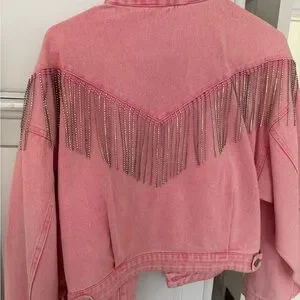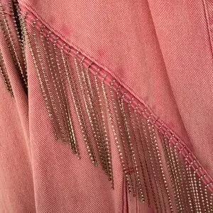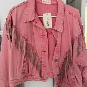 Elevate your style with The Nines pink jean jacket. Featuring chic fringe detailing, this jacket adds a trendy touch to any outfit. Perfect for casual outings or a night out.