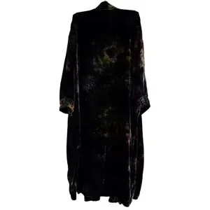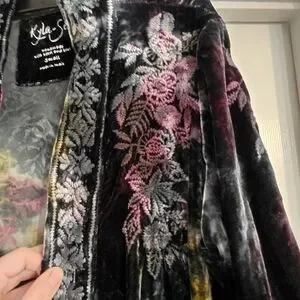 Pre-loved Kyla-Seo Embroidered Dark Tie Dye Velvet Duster. Size small, no stretch, see measurements. Im 5'6 and it falls right below my knees. Colors are black, blue, purple, green, yellow, and white. Embroidered all down the front, at the chest, at the bottom, arms, and wrists. Sleeves are not full length. It has POCKETS! Rayon and silk. RN# 152454.