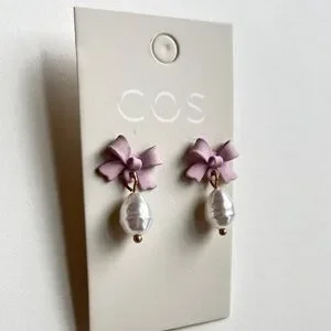 Elegant earrings featuring pink bows and pearl drops. Perfect for adding a touch of sophistication.