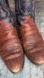 Men’s cowboy boots, western boots, brown leather foot, textured leather boot, multi color stitching boot, buckaroo boot, Justin Boots, pull on western boot