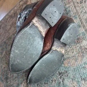 Stylish western boots with intricate stitching. Black shaft with detail stitching and brown foot. Perfect for any cowboy look. These boots have been loved well. See pics for details and let me know if you have questions.