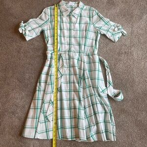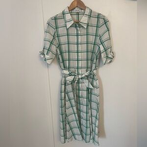 Calvin Klein White and Green Plaid A Line Shirt Dress Hidden Pockets 50’s style