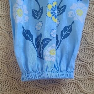 Charter Club Blue Linen Blouse with Floral Printed Sleeves - Size L