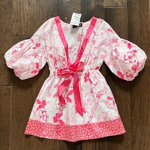 Beautiful pink and white floral pattern, flattering V-neck with a silk tie, elastic waist for a comfortable and cinched fit, puff sleeves with stretchy elastic that lets you style them with more or less volume, silk trim and silk tie accents, roomy bust area.