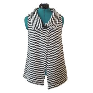 Chico’s black and white chevron knit sweater vest. Cozy open-front style with oversized collar and a single button closure at neckline. Sleeveless design, mid-thigh length, and chunky knit texture make this a versatile layering piece.