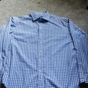 Polo button up long sleeve blue and white check with bright green pony logo.
