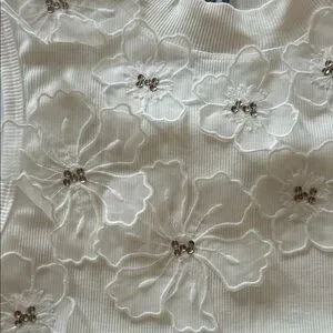 This elegant white sleeveless top features delicate floral embellishments, perfect for a chic and sophisticated look. Ideal for any occasion.