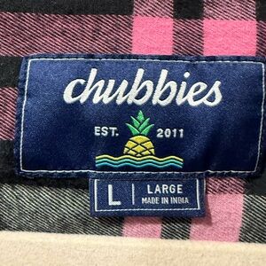 The product is a men's Chubbies button-up shirt in size Large, featuring a pink and black plaid design. Made from cotton flannel fabric, this regular fit shirt is perfect for casual occasions or travel. It has a collared neckline with a button-down style, long sleeves, and convenient pockets. Easy to care for with machine washable instructions, this versatile shirt is suitable for all seasons and adds a pop of color to any outfit.