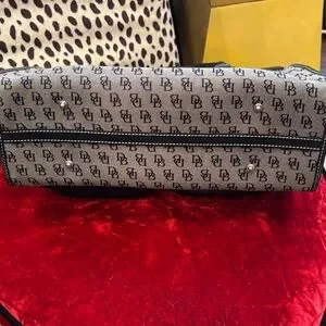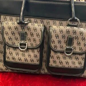This item is a vintage Dooney & Bourke Signature monogram canvas and black leather trim double pocket large tote satchel shoulder bag. The shoulder strap is missing or lost can’t find it but all in all it I. Great condition and very clean see pictures