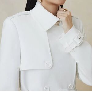 Elegant white trench coat. Double-breasted design. Belted waist. Classic and stylish.