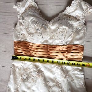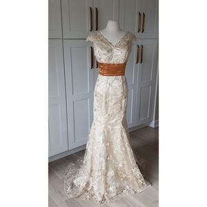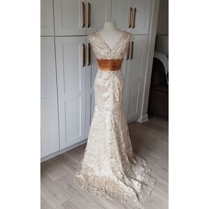 Lace Mermaid Gown Womens 10 Ivory Gold Waist Belt Formal Evening Dress