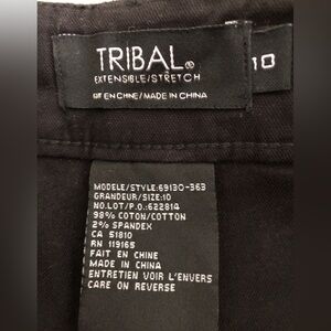Tribal Extensible/Stretch black cotton Capri pants. Zipper fly with button closure. Two slash pockets in front, no pockets in back. Small vents at leg opening. Fabric is 98% cotton, 2% spandex; machine wash.