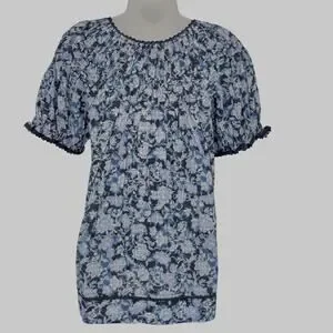 NWOT Sundance Blouse Top XS Blue Floral Smocked Puff Sleeve Lace Henley Tropical