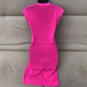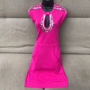 Nanette Lepore pink knit dress with pockets & embellishments at shoulder tops & front key hole with button closure. Marked a size S & measures approximately 38” shoulder-hem, 15.5” chest, 14” waist, & 16.5” at hips while laid flat. Please see images for as-is condition. Ships from no smoke/pet home.