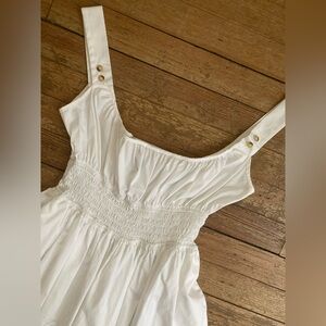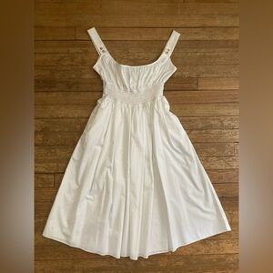 The Lara Dress in white cotton is a midI-length tank dress featuring a wide neckline and shirring at the bust. The dress has pockets as well as smocking around the waist.