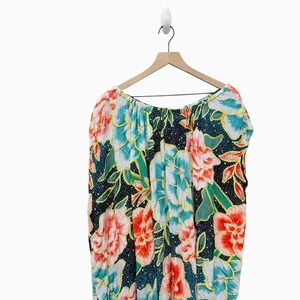 Radiant blooms cascade across this Mara Hoffman Swim cover-up dress, conjuring images of sun-drenched gardens and breezy shores. This off-the-shoulder maxi dress offers an effortless silhouette, perfect for transitioning from poolside lounging to seaside cocktails. The vibrant floral print, set against a dark backdrop with delicate polka dots, exudes bohemian chic, while the flowing design provides comfort and freedom of movement. Its lightweight fabric drapes gracefully, making it an ideal choice for beach vacations, tropical getaways, or simply adding a touch of resort-inspired style to your summer wardrobe.