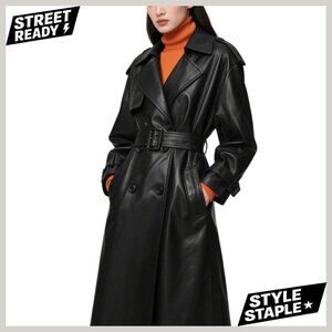 Faux Leather Trench Coat Double Breasted Belted High Waist Long Jacket