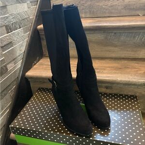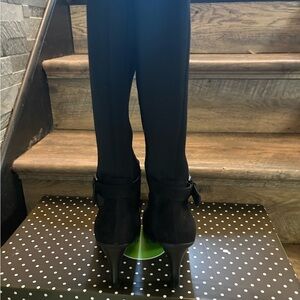 Chic over the knee boots with sleek design. Features a stylish buckle detail. Perfect for versatile wear.