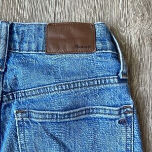 These Madewell jeans feature a classic straight leg design in a medium-wash blue denim, enhanced by subtle fading for a casual, worn-in look. The consistent color and natural fade patterns around the thighs and knees add a touch of character to these versatile jeans.