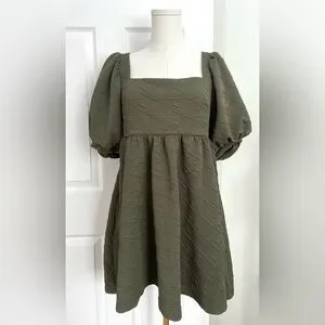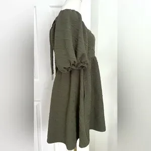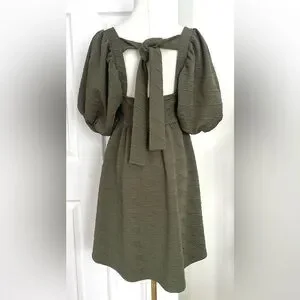 Square neck. Puffed sleeve silhouette. Ribbon tie at back. Elastic waistline at back. Pleating for added dimension.