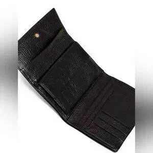 Authentic Vintage Gianni Versace black pebbled leather trifold billfold compact wallet made in Italy. Features the iconic Medusa head emblem set in a silver-tone ring on the front flap and embossed interior branding. Classic unisex design suitable for both men and women.