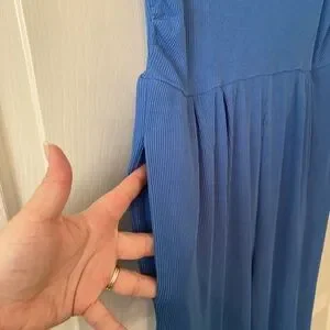 This elegant blue sleeveless jumpsuit is perfect for any occasion. Its flowing design offers both comfort and style. Has cowl neck style and pockets. Flare pant legs with zipper in the back. Small hole in zipper seem seen in pic. 28” inseam 42” waist to pant cuff. Super comfy and very stretchy