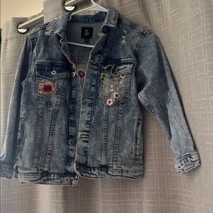One of a kind denim jacket featuring beautiful floral embroidery. Perfect for adding a touch of charm to any outfit. Boho American Vintage