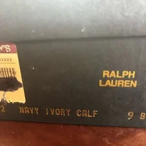 These are Lauren Ralph Lauren Addison loafers. They feature a classic two-tone, colorblock design in navy blue and cream leather with a signature gold-toned polo player logo on the insole and box. New in original box. Size 9