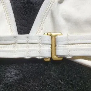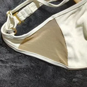 L*Space Macey Bikini Top. Size medium. NWT, never worn, no damage. Cream color with tan mesh on the sides and gold accents on the back. V-wire in the front. Adjustable straps. Hook in the back. No padding. Ribbed texture. Pair this with any color bottoms.