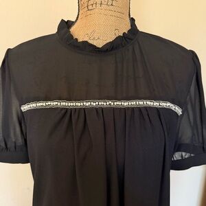 This elegant black top features chic silver accents, perfect for any occasion. Its stylish design offers a sophisticated look. Shorter style and cut small for the size. Open to offers. Thank you for your interest.