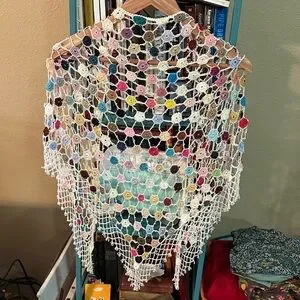 Beautiful crochet shawl with multicolor floral patterns. Perfect for adding a pop of color to any outfit. ~56” length. ~27” widest part of shawl. Vintage boutique shawl with crochet and beaded handwork. From late 80’s. Good Preowned condition. Noticed a few loose threads but not really noticeable.