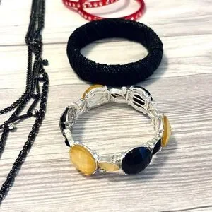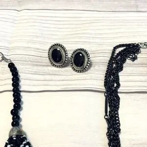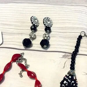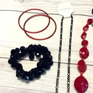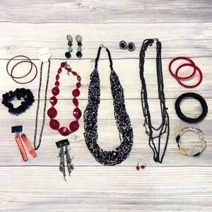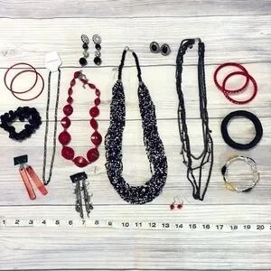 Description: Gorgeous lot of 16 pieces of costume jewelry in red, black, and silver tone. Includes necklaces, bracelets, and earrings! You will receive everything pictured.
