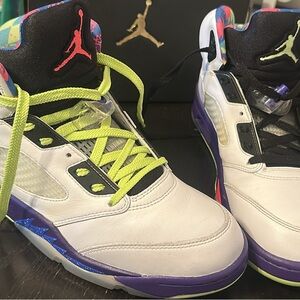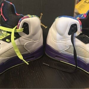 The Air Jordan 5 "Alternate Bel-Air" (is a white leather, 90s-inspired sneaker honoring The Fresh Prince of Bel-Air. It features vibrant, mismatched ghost green and racer pink accents, a purple midsole, and a graphic liner